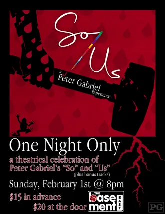 One Night Only!! A theatrical celebration of Peter Gabriels So and Us plus bonus tracks performed by some of Nashvilles finest studio musicians.
