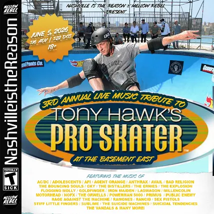 The best musicians in Nashville and surprise special guests will once again choose their favorite songs from the Tony Hawk Pro Skater soundtracks to perform live at The Basement East! And while thats happening on stage, you can take turns playing Pro Skater during the show on game consoles and projection screens set up in the venue!The music from the Pro Skater games changed so many of our lives and introduced tons of people to incredible punk, alternative, metal and hip hop artists! Expect to hear live bands cover songs by Bad Religion, Adolescents, Ramones, Agent Orange, The Explosion, The Bouncing Souls, Millencolin, Motorhead, The Suicide Machines, Rancid, Flogging Molly, Iron Maiden, The Orwells, Goldfinger, Primus, NOFX, Sex Pistols , Suicidal Tendencies, Rage Against The Machine, The Ernies, AFI, Avail, AC/DC, Powerman 5000 , Stiff Little Fingers, Sublime, The Distillers, Bodyjar, Social Distortion, Dead Kennedys, CKY, Lagwagon, Rise Against, Swingin Utters, Strike Anywhere, Aesop Rock, Anthrax & Public Enemy, Gang Star, House Of Pain, Less Than Jake, NWA & more!