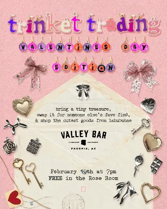 VALENTINES DAY TRINKET TRADING!Bring a tiny treasure to swap with new friends, or bring your bestie to shop the cutest goods from Labububae. Free in the Valley Bar Rose Room starting at 7 pm. Tuesday, February 10th 202621+