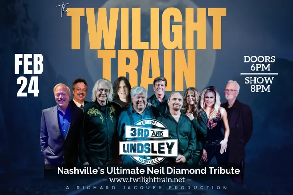 The Twilight Train returns to 3rd s most accomplished musicians, each equipped to take you on a musical journey that celebrates the iconic music of Neil Diamond. Without trying to impersonate, the Twilight Train strives to recreate the unique energy of a Neil Diamond show at every performance.Staying true to the original releases, the Twilight Train adds its own unique flair and energy to every performance. Twilight Train musicians each dedicated to honoring the music of Neil Diamond with a high-energy set list of his most beloved hits have toured and recorded with some of the biggest names in the music industry. Band members include Richard Jacques on vocals, backed by Gary Talley, David Santos, Ron Krasinski, Mike Stewart, Scott Ducaj, Tom McKinley, Bill Huber, Michelle Murray and Tracey DiCicco. In December, The Twilight Train was recently asked to perform at the Nashville premiere of the hit new movie Song Sung Blue, about a Neil Diamond tribute band.From Sweet Caroline to Cracklin Rosie, the Twilight Trains performances are filled with all the familiar sounds that have made Neil Diamond a beloved artist for generations. So climb aboard the Twilight Train and let us take you on a ride you wont soon forget!