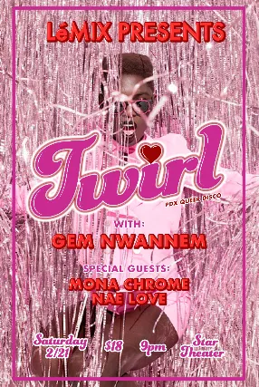 Saturday February 21st join us for Twirl, a monthly queer dance party ... this months theme is Love & Disco! Sounds: Disco / House / Funk & Boogie!Guest dj Gem Nwannem (Seattle)Resident dj LMix Special Guest Drag Performances from Mona Chrome & Nae Love! Looks always encouraged! As this months theme is Love & Disco feel free to don all shades of Red, Pink or White, anything with hearts or any outfit that you simply love! This months charity is Black and Beyond the Binary Collective, this org builds the leadership, healing, and safety for Black - African transgender, queer, nonbinary, Two-Spirit, intersex and asexual (TQN2SIA+) Oregonians. There will be a donation jar at the door or you can contribute digitally here, https://blackandbeyondthebinarycollective.networkforgood.com/ Sat. 2/21 ~ 9pm ~ $18* ~21+Tickets available via Star Theater and at the door via Venmo, Cash app, or cash money:) *no one turned away for lack of funds* This is a LGBTQIA+ event where these identities are centered and celebrated! Queer joy ftw! Consent is essential. Be friendly, be kind. Leave the patriarchy behind! Bring a friend or just yourself, just dont forget the groove in your heart! Now lets Twirl girl! More info on IG @twirl.pdx
