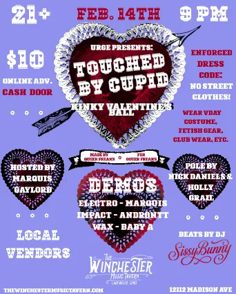 URGE PRESENTS: TOUCHED BY CUPID KINKY VALENTINES BALLSaturday, February 14th, 20269pm start time$10 Advance Tickets 21+ Roses are red, bruises are blue, we have the freakiest Valentines Day party for you! Dancing - Demos - Performances - Vendors Notice: This event has an enforced dress code. No street clothes allowed. Wear a Valentines Day themed costume, club wear, kink/fetish gear, goth, glamour, black tie whatever lights your freaky fire. Coat racks available - first come, first serve.