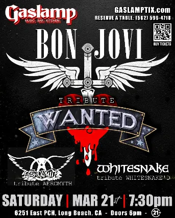 WANTED - The Ultimate Tribute to BON JOVISATURDAY, MARCH 21stGASLAMP LONG BEACH7:30 pmSpecial Guests: AEROMYTH - Tribute to AEROSMITHWHITESNAKED - Tribute to WHITESNAKE TICKETS ARE FOR ENTRY ONLY...FOR TABLES MUST ALSO MAKE DINNER RESERVATIONS at (562)596-4718 or info@gaslamplongbeach.comNO REFUNDSNO EXCHANGESGaslamp Long Beach6251 PCH