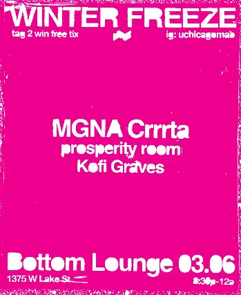UCHICAGO MAB presents WINTER FREEZE! Going on for its fourth year, Winter Freeze is MABs highlight of the winter, highlighting electronic acts including rising artists, local Chicago talent, and DJs on UChicagos campus. Our lineup features: MGNA Crrrta, NYCs hottest electro pop duo fresh off their newest album Beautiful DisasterProsperity Room, king of Chicagos club circuit.UChicagos own Kofi Graves, winner of the DJ battle. Our acts are bringing the party to UChicago! Bring your friends + buy limited tickets at Bottom Lounges site.$5 for UChicago Students (with special code), $15 for general public 17+SEE U THERE!https://www.instagram.com/uchicagomab