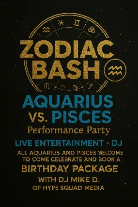 Thursday, February 19th8:00P - LateHype Squad Media Presents...ZODIAC BASH: Birthday Party & Performance SeriesAQUARIUS VS. PISCES EDITIONAll Aquarius & Pisces Welcome To Come Celebrate!Live Entertainment + DJSounds By: DJ Mike DFood By: TBABook your birthday package at letmebookitnow.com$10 Early Bird | 21+