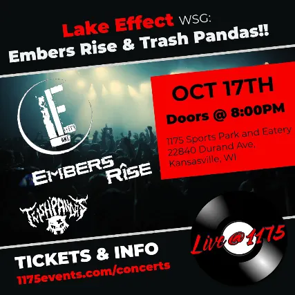 The much-loved Lake Effect is returning to 1175 to headline!! Come help Lake Effect and us give Embers Rise and Trash Pandas a warm goodbye before they leave for a tour out west starting at the famed Whisky a Go Go in Hollywood!General Admission $5 (plus fees) online or $10 at the door.Anyone under 18 years of age must be accompanied by an adult.NO CAMERAS ALLOWED. (Cell phones are okay) For more information see the Camera Policies page on our website at https://www.1175events.com/camerapolicies.NOTE: Along with being seen by our security cameras, you may be captured by our inhouse media team in a photo or video while at an 1175 event. Any photos and videos made by the 1175 staff or our inhouse media crew may be used to promote 1175 events online or in print. By attending any event at the 1175 Sports Park and Eatery building or the 1175 Event Center / Hall you agree to these terms.